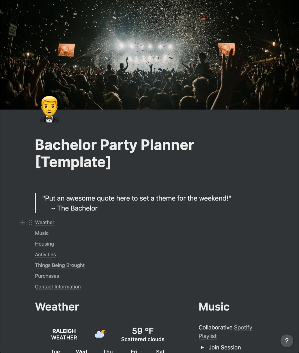 This template is a MUST have for helping plan and making sue that the entire experience goes a smooth as possible. Equipped with music, itinerary, contact information, payment information, and even embedded widgets for convenience this template is a one stop shop for your next bachelor/bachelorette party!